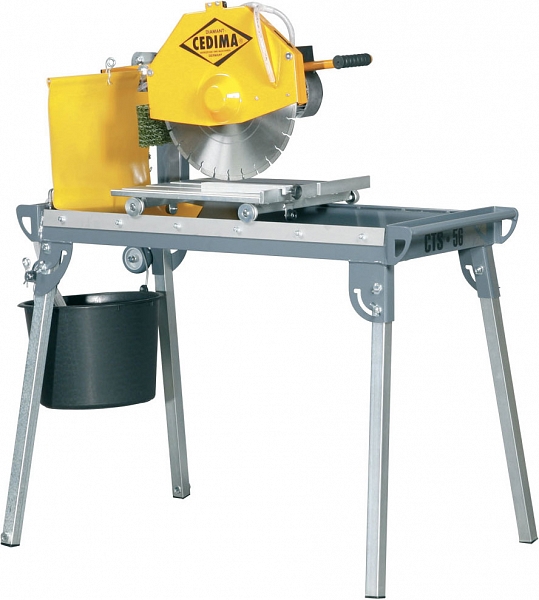 Камнерезный станок Cedima CTS-56 (Цедима ЦТС-56) с подачей воды – маятниковая настольная пила для быстрой, четкой, точной, мокрой резки бетона, кирпича, клинкера, плитки, кафеля, мраморных плит, натурального камня, плит из промывного бетона, брусчатки и других подобных материалов длиной до 600 мм, толщиной до 130 мм, под прямым углом с помощью алмазных дисков.