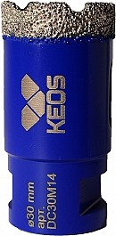 Коронка алмазная по керамограниту Keos Professional Vacuum Brazed M14 30 мм (Кеос Профессионал Вакуум Брейзед М14 30 мм) – корончатое сверло для сверления отверстий Ø 30 мм в керамической плитке, керамограните, граните, мраморе и других видах камня, как на сухую, так и с охлаждающими жидкостями, с использованием сетевых электрических и аккумуляторных УШМ.