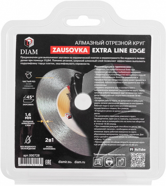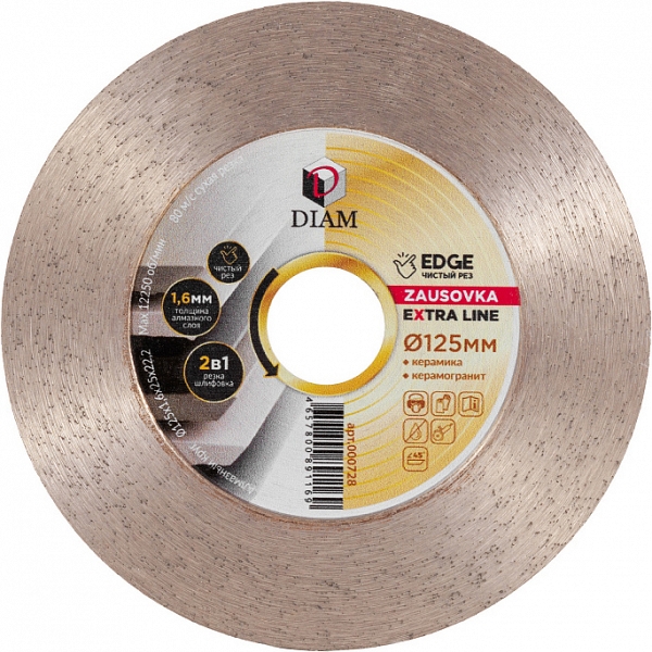 Круг алмазный Diam Extra Line 1A1R Корона Zausovka Edge 125 мм (Диам Экстра Лайн 1А1Р Корона Заусовка Эйдж 125 мм) – специальный тонкий 1,6 мм алмазный диск для резки и шлифовки (заусовки) керамической плитки и керамогранита.