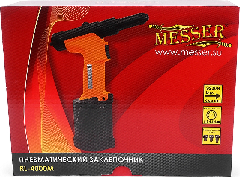 Пневматический вытяжной заклепочник Messer RL-4000M (Мессер РЛ-4000М) – надежный профессиональный пневмозаклепочник (пневмо заклепочный пистолет) для установки металлических (алюминиевых, медных, стальных, нержавеющих стальных) вытяжных заклепок Ø 3,2 – 4,8 мм.