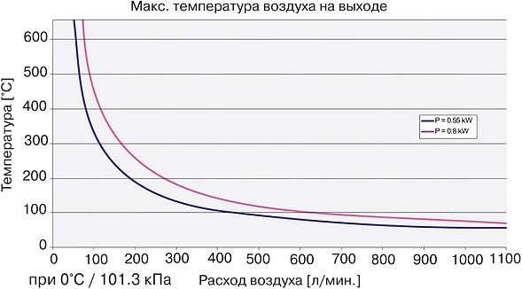 - Температура горячего воздуха 3 мм от выходного отверстия, измерена в самой горячей точке