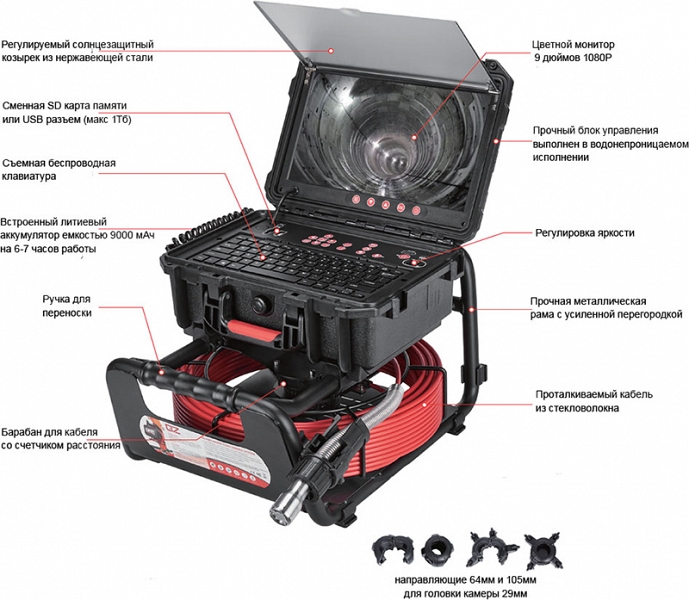 - Головка камеры Ø 29 × 50 мм и проталкиваемый кабель Ø 6,8 мм × 50 м из стекловолокна со счетчиком длины, подходящие для труб Ø 50 – 200 мм, длиной до 50 м
