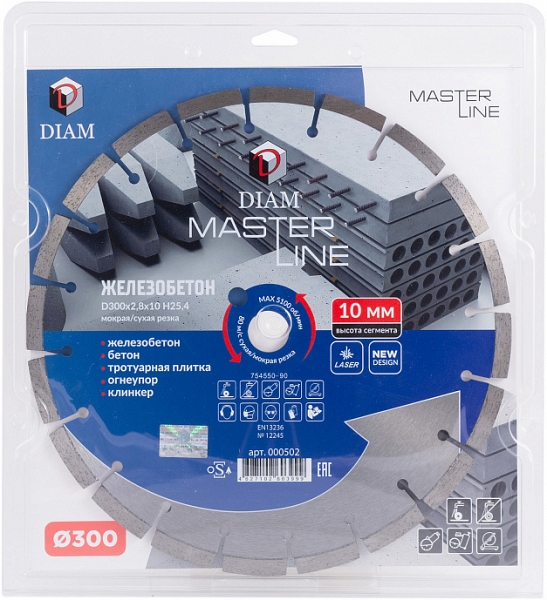 Сегментный алмазный круг Diam Master Line 1A1RSS Железобетон 300 мм (Диам Мастер Лайн 1А1РСС Железобетон 300 мм) – профессиональный алмазный отрезной диск для сухой и мокрой резки бетона, армированного бетона (железобетона), тротуарной плитки, кирпича, клинкера, огнеупоров и других строительных материалов, схожих по характеристикам, на бензорезах, электрических резчиках и плиткорезах, камнерезных станках, стенорезных машинах, швонарезчиках и другом оборудовании, с подачей и без подачи воды.