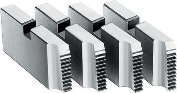По одной универсальной автоматической резьбонарезной голове 1/16" – 2" и 2 1/2" – 3" для всех видов резьбы, в том числе длинной резьбы, открывающиеся после нарезания установленной длины конической резьбы. 5 резьбонарезных гребенок универсальной автоматической резьбонарезной головы 2 1/2" – 3" оптимально распределяют режущее усилие по трубе, за счет этого круглая чистая резьба. Точная, быстрая установка диаметра резьбы, удобная шкала установки диаметра. Ограничитель для конической резьбы. Быстрая смена гребенок за счет пазового крепления в держателе гребенок. - Резьбонарезные плашки:
