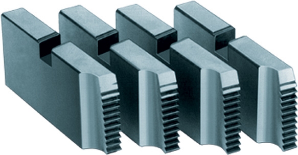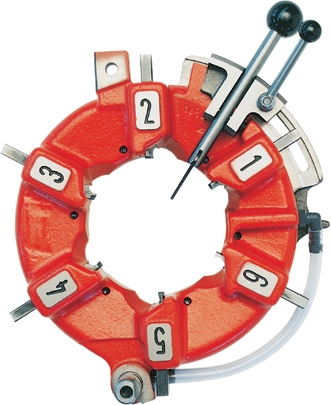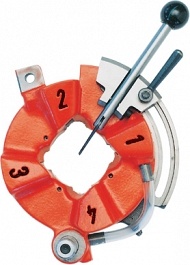 - Две универсальные резьбонарезные головки с автоматическим открыванием для труб Ø 1/16" – 2" (4 резьбонарезные гребенки 1/2" – 2") и для труб Ø 2 1/2" – 4" (6 режущих резьбонарезных гребенок 2 1/2" – 4" для высокого качества резьбы) для всех видов резьбы